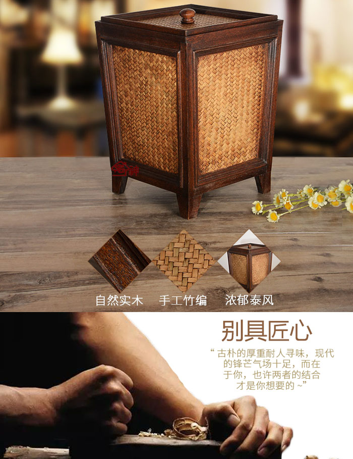 5Cgo 43018390647 泰國復古藤編紙簍大號帶蓋方形酒店客廳木質垃圾桶家用廢棄物收納垃圾筒客廳會所臥室書房 CHX72100