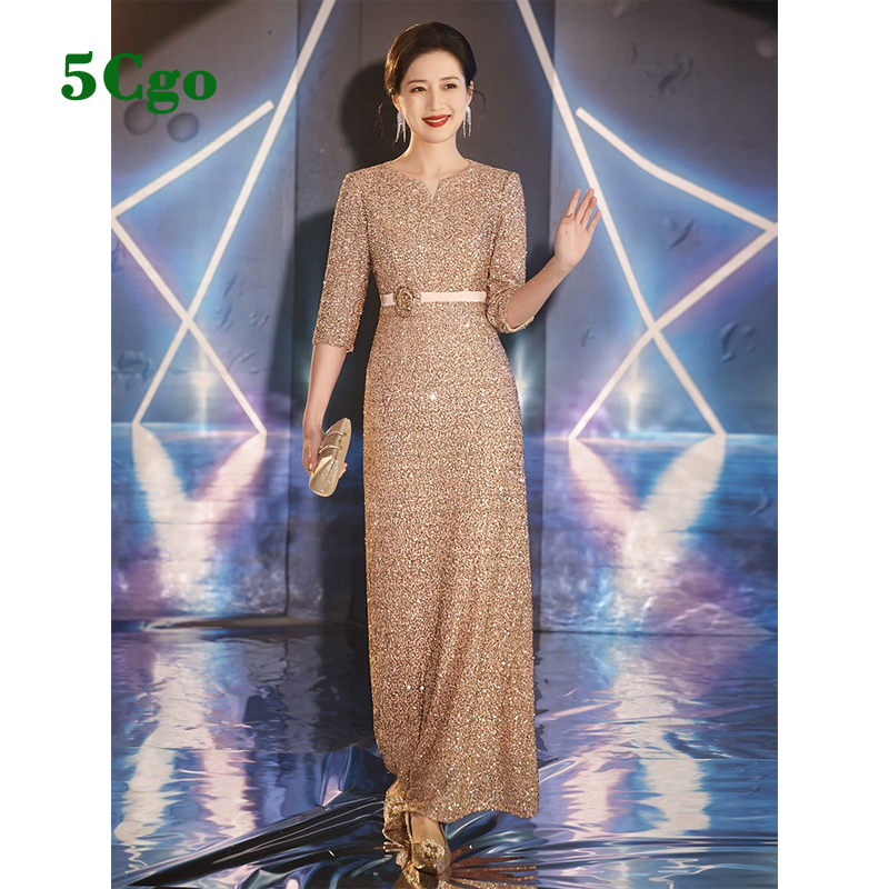 5Cgo【鴿樓】香檳色亮片晚會晚宴氣質主持人媽媽禮服洋裝婚宴派對長裙t761476059020