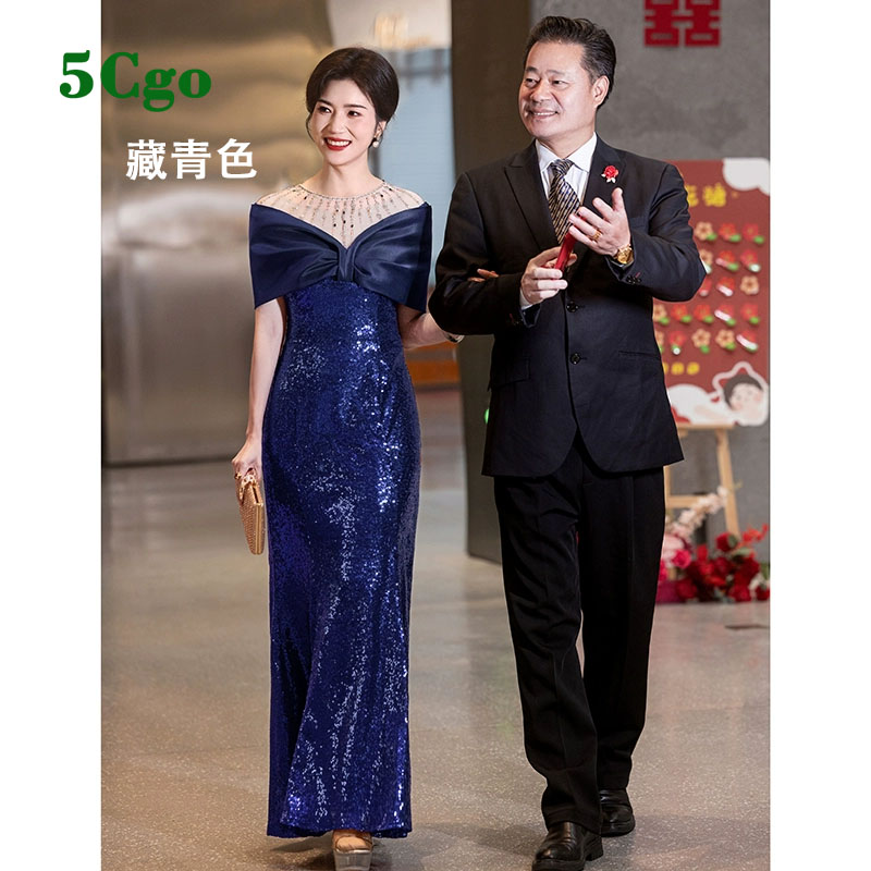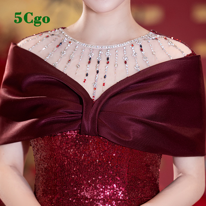 5Cgo【鴿樓】紅色亮片一字肩包臀魚尾晚禮服年輕媽媽婚宴裝主持人洋裝t871076336307