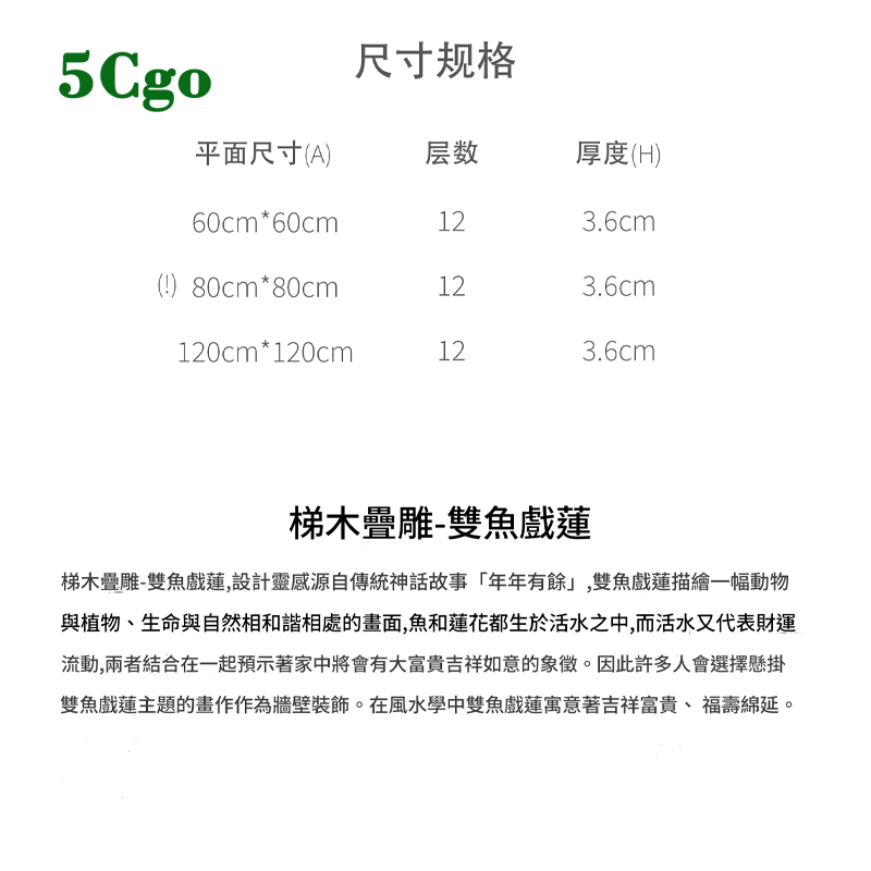 | | 商品名稱: | 5Cgo【樂趣購】梯木疊雕雙魚戲蓮圓形牆面裝飾客廳背景牆面裝飾壁掛餐廳立體裝飾畫t688155562347 | 商品尺寸: | 60cm、80cm、120cm | 材質: | 新西蘭進口E0級椴木板 | 顏色: | 彩色 | 出貨配件: | 出貨僅木雕壁畫。(默認出貨80cm) 60cm-13350元 80cm-19180元 120cm-32799元 | 商品詳情: | 商品編號:t688155562347 ✨1.疊雕畫是什麼材料?環保嗎? 梯木疊雕選用紐西蘭進口EO級椴木板,經過雷射切割後由環保乳膠黏接,表面塗刷清漆,經三天靜置後完成,確保環保無害。