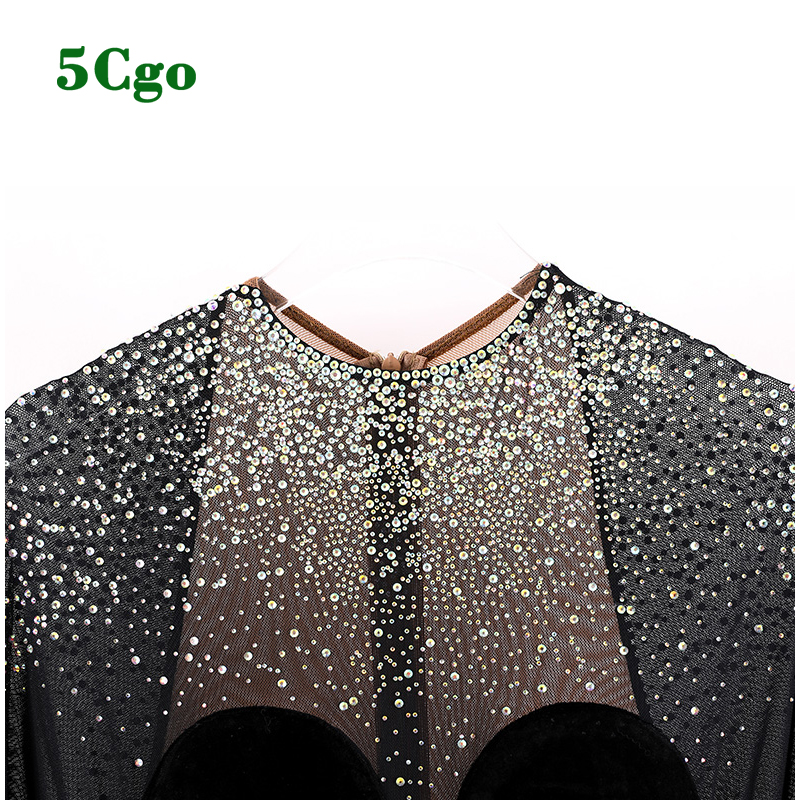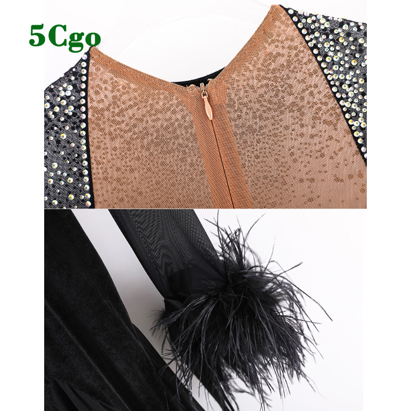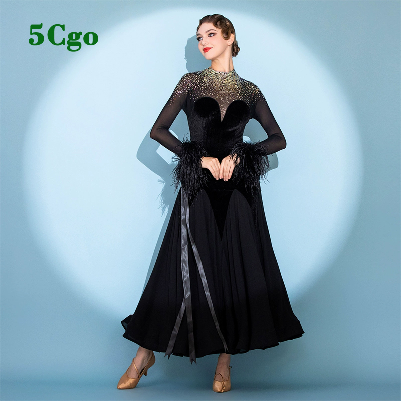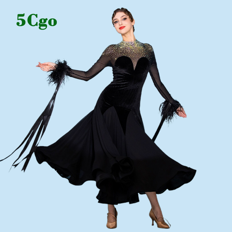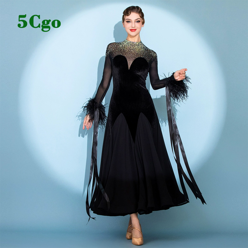 5Cgo【鴿樓】摩登舞裙標准舞練功服演出服黑色絲絨羽毛飄帶設計國標舞連衣裙華爾茲燙鑽長裙舞衣t922668339887