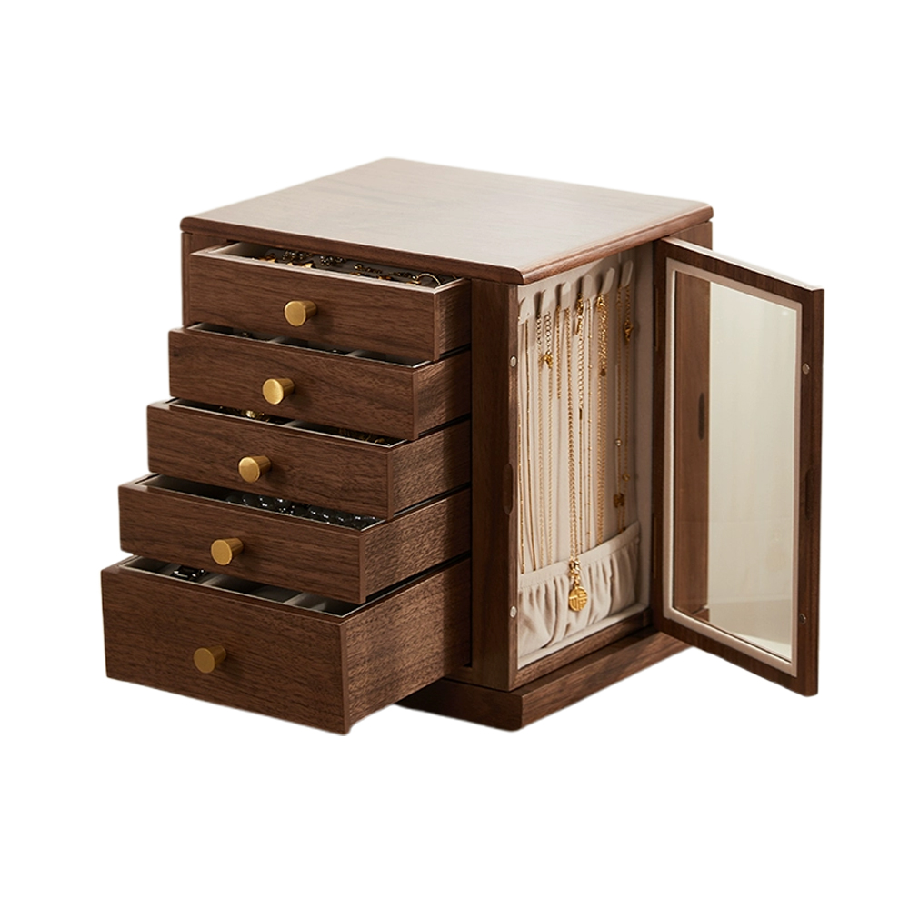 5Cgo 566148756331 旅行宴會外出包攜帶式首飾盒實木旅行隨身手飾耳釘飾品收納盒迷你珠寶盒黑桃木帶化妝鏡AGL86000