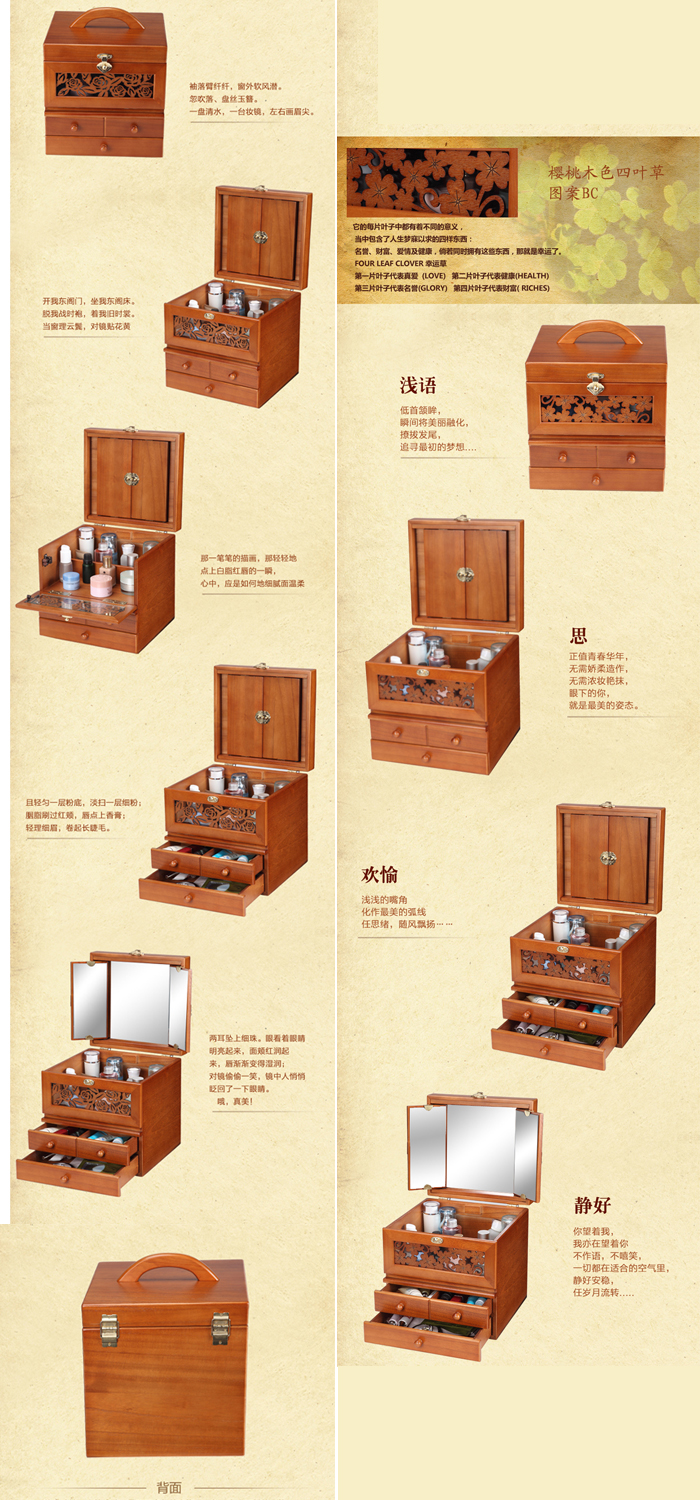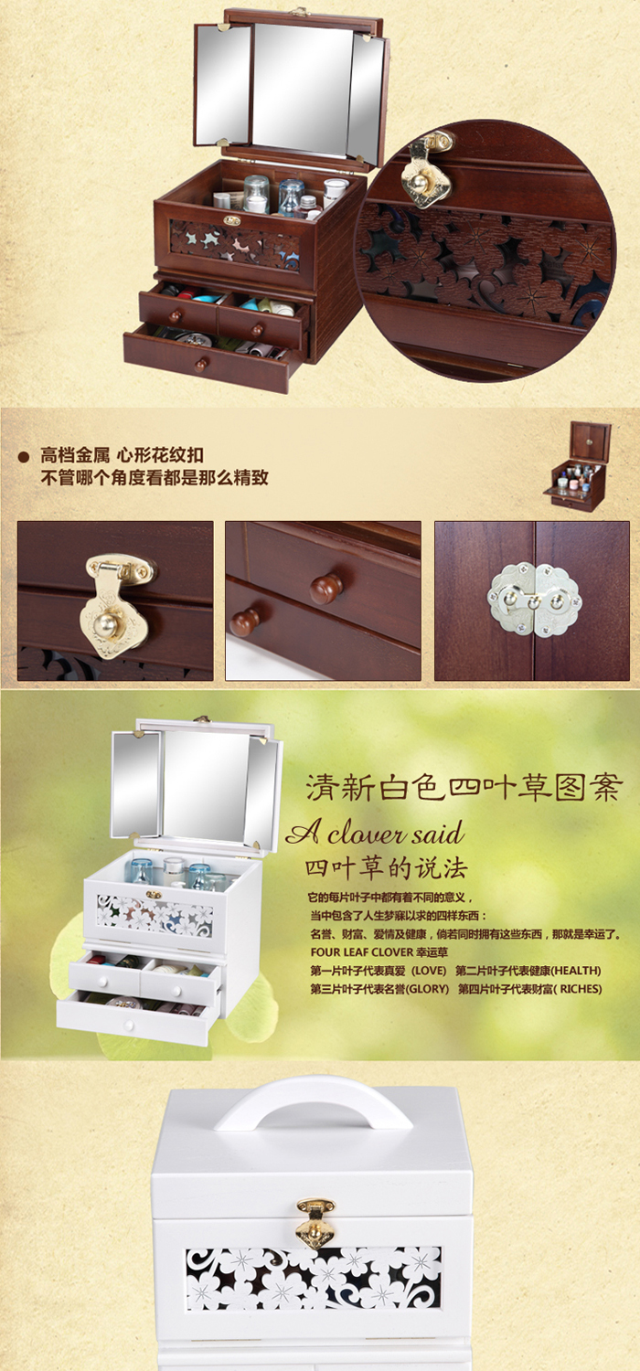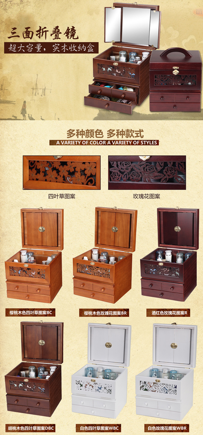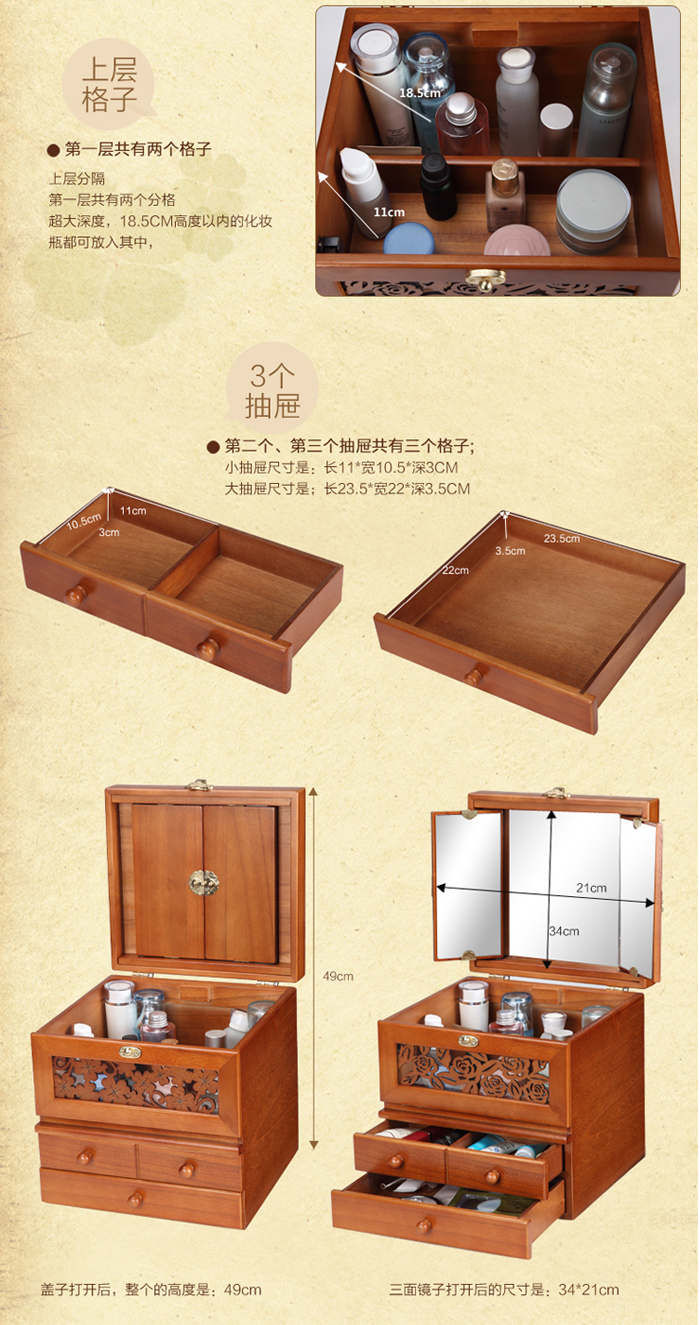 | 商品编号 : | 41502574709 | | 商品名稱: | 雕花木質化妝箱實木化妝盒大號桌面整理箱化妝品收納盒梳妝盒 儲物盒 飾品盒 | | 商品材質: | 東北優質桐木。 | | 商品尺寸: | 27*27*32.5cm | | 顏色分類: | 原木色玫瑰圖案,原木色四葉草圖案,酒紅色玫瑰圖案,白色玫瑰圖案,白色四葉草圖案,胡桃木色四葉草圖案。 (出貨不含其他飾品) 。 | | 注意事項: | ★商品均為實物拍攝,由於光線顯示器等原因圖片顏色可能與實物有些偏差、請以實物為准 ★購買前請務必仔細查看商品的尺寸,人工測量誤差1-3cm左右屬於正常的哦 ★剛出廠的商品可能有點氣味,拿去曬曬就可以了哦 ★因商品顔色或批次不同,內襯可能不同