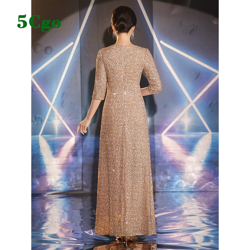5Cgo【鴿樓】香檳色亮片晚會晚宴氣質主持人媽媽禮服洋裝婚宴派對長裙t761476059020