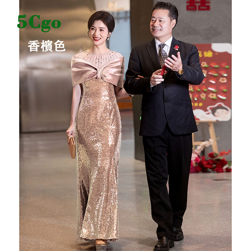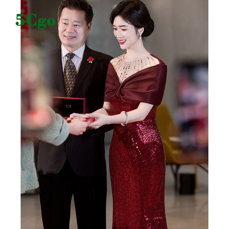 5Cgo【鴿樓】紅色亮片一字肩包臀魚尾晚禮服年輕媽媽婚宴裝主持人洋裝t871076336307