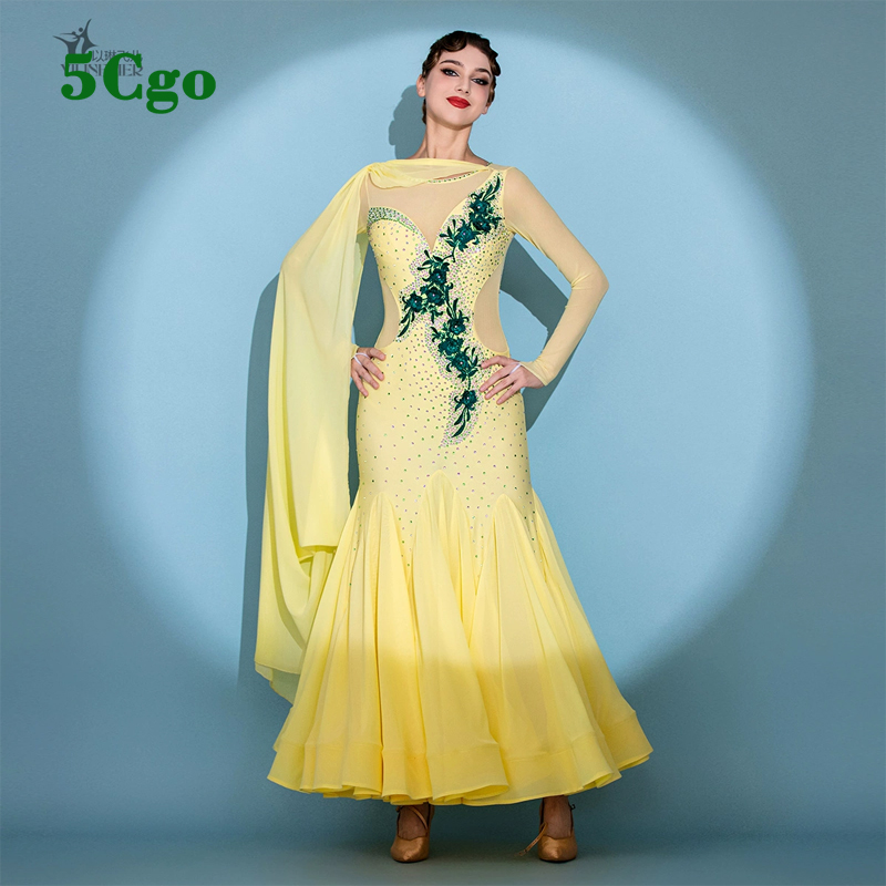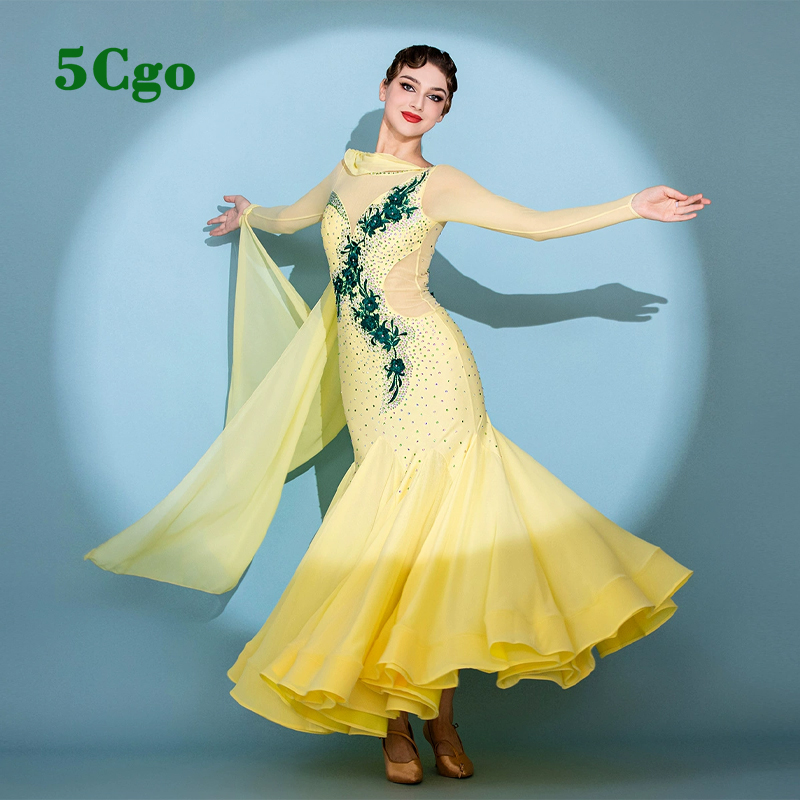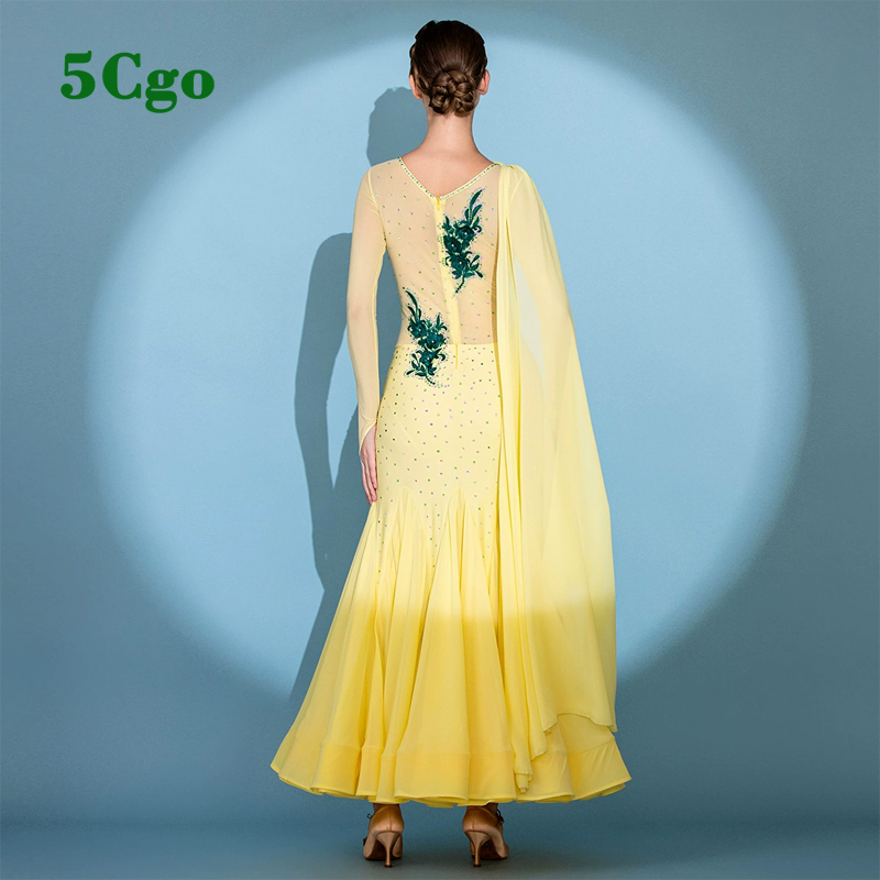 商品名稱: 5Cgo【 鴿樓】摩登舞裙標准舞舞會舞服包臀魚尾黃色長袖網紗透視後背修身飄逸裙擺華爾茲舞衣t925304077225