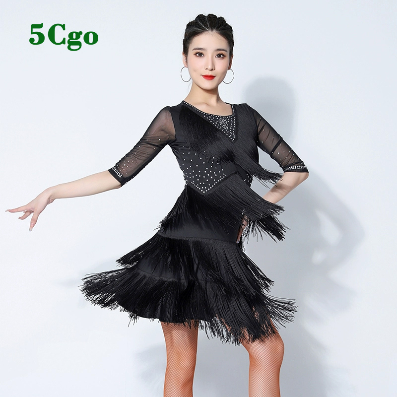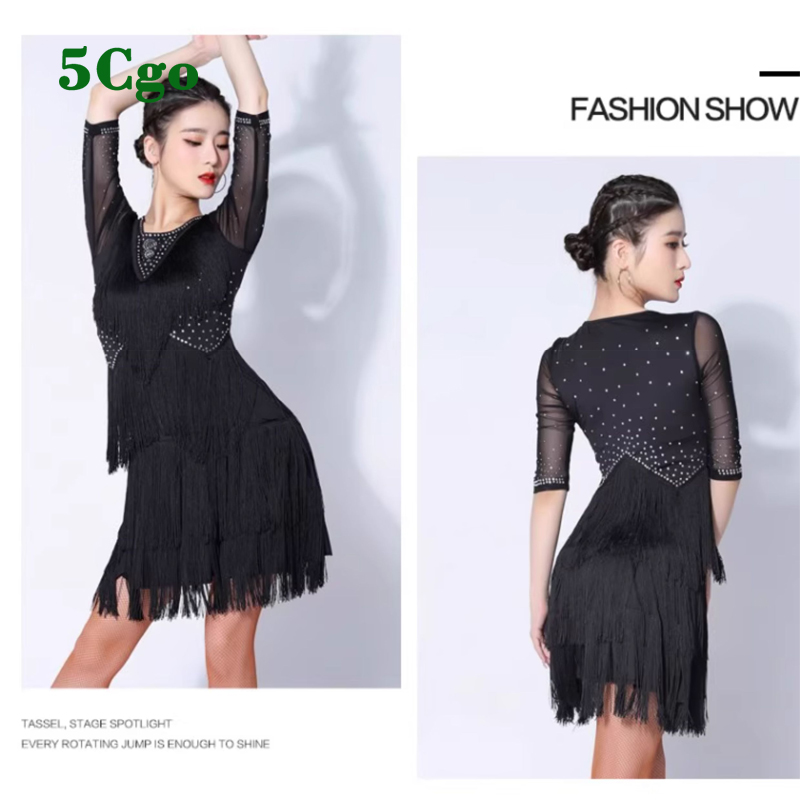 sale_title  5Cgo【鴿樓】拉丁舞連衣裙流蘇燙鑽中袖練功裙舞蹈服比賽服演出服裝另有紅色藍色t704455996957
