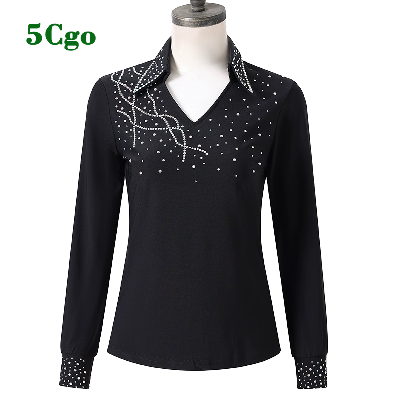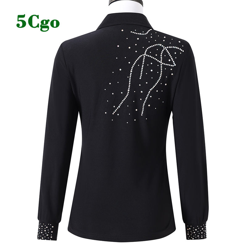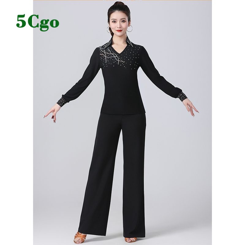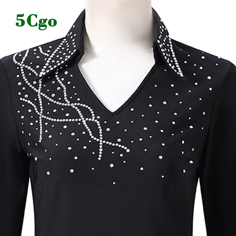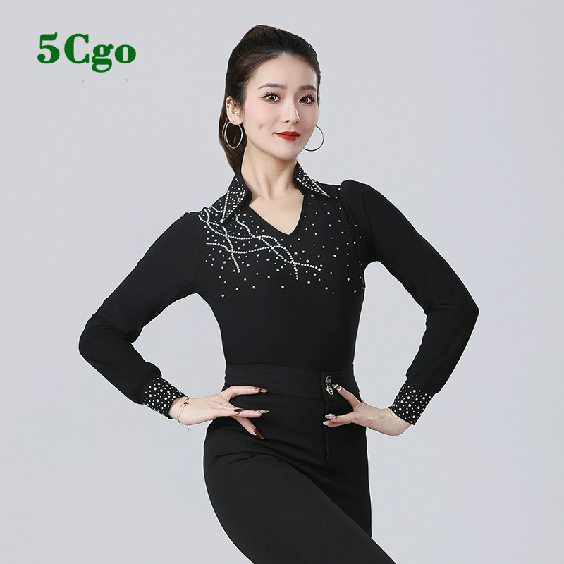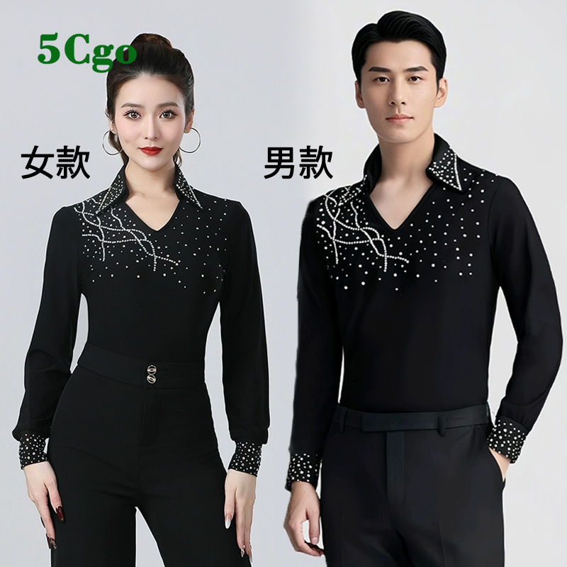 5Cgo【鴿樓】拉丁舞上衣男女同款黑色長袖燙鑽V領摩登舞交誼舞練功服裝表演比賽演出服團體隊服t920722049190