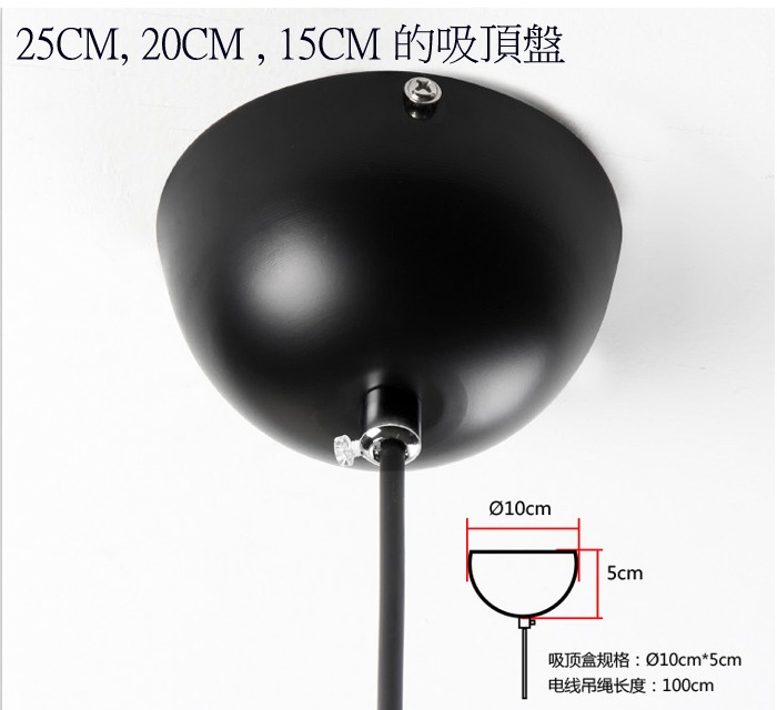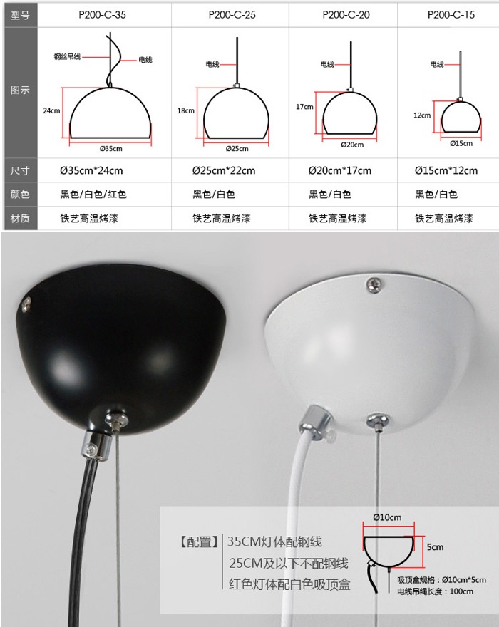 商品詳細 : 【型號】P200-C-35 【尺寸】請見上方圖片說明 【材質】五金 【顔色】白色或者黑色 【工藝】旋壓、烤漆 【光源】E27螺口燈頭*1個/不帶開關/選配光源 【適用】臥室/書房/餐廳